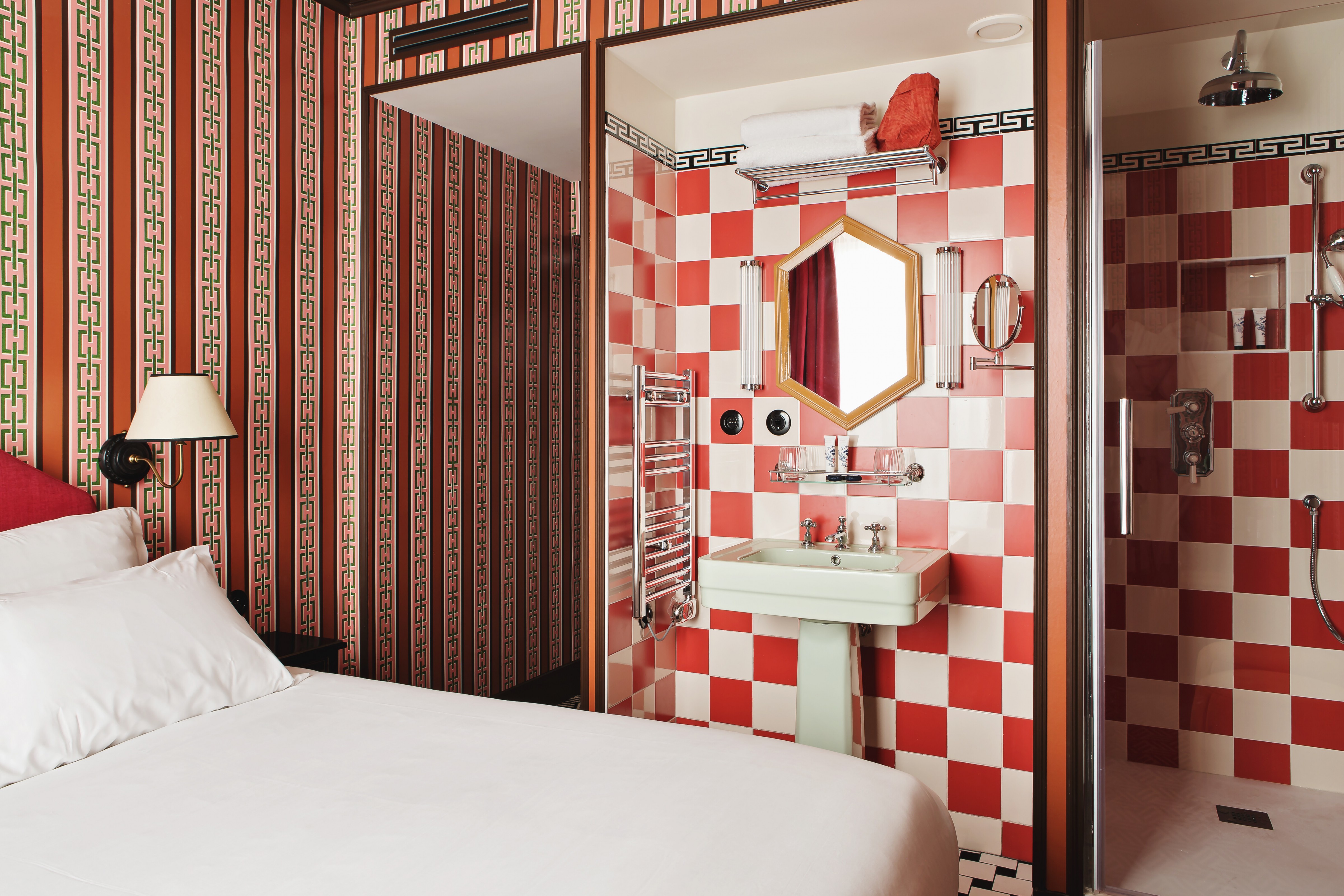 La Suite Deluxe, d’une superficie de 25 m², offre un cadre élégant et spacieux. Elle dispose d’un lit King Size, d’un petit lit supplémentaire, d’une salle de bain équipée d’une douche et d’une baignoire et offre une vue sur les rails ou la rue. Son aménagement ouvert met en valeur la lumière naturelle, avec une baignoire sur pieds qui s’invite dans l’espace nuit et un coin salon habillé de velours et de motifs graphiques.